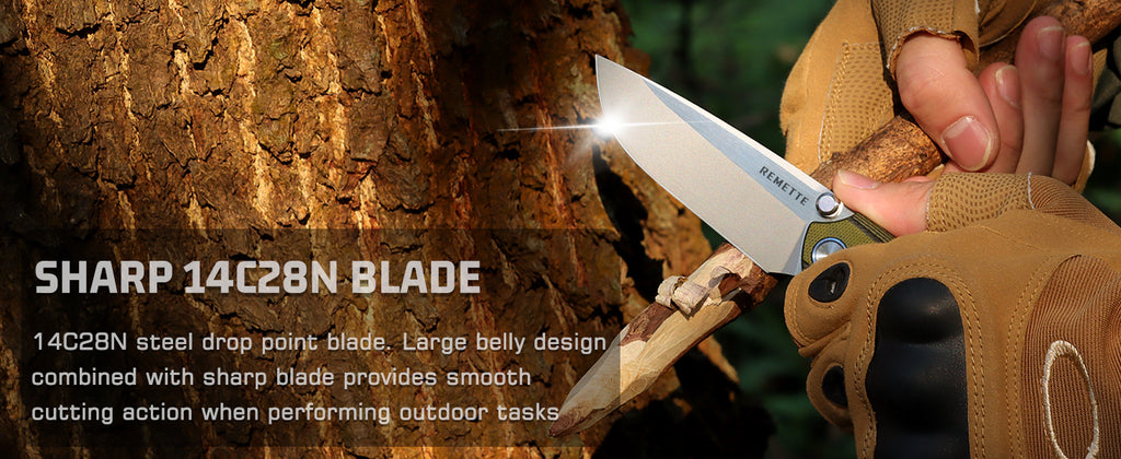 【14C28N STEEL BLADE】-14C28N steel drop point blade. Large belly design combined with sharp blade provides smooth cutting action when performing outdoor tasks!