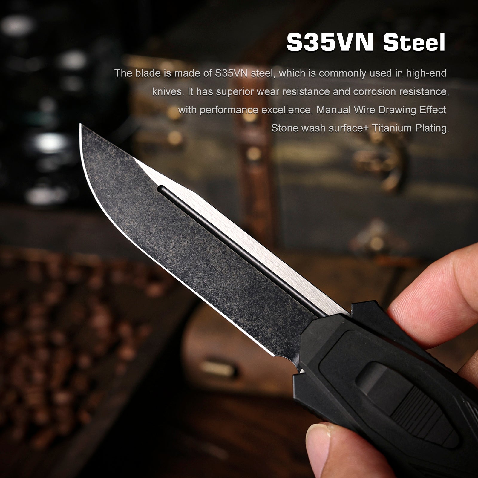Blade Finish: Titanium Plating+Stone wash surface effect + Manual Wire Drawing Effect